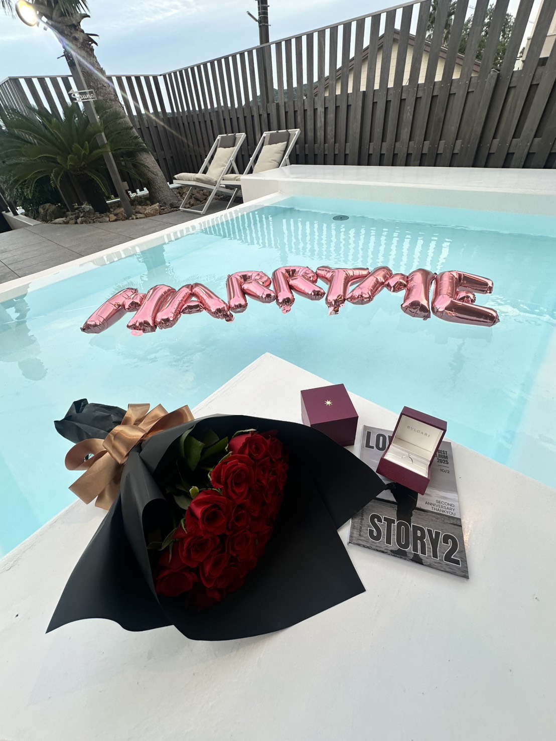 当日はバラの花束(28本)を用意され、リビングより繋がる2階テラスにてプロポーズされ 見事に成功されました写真となります おふたりの末永い幸せを願っております